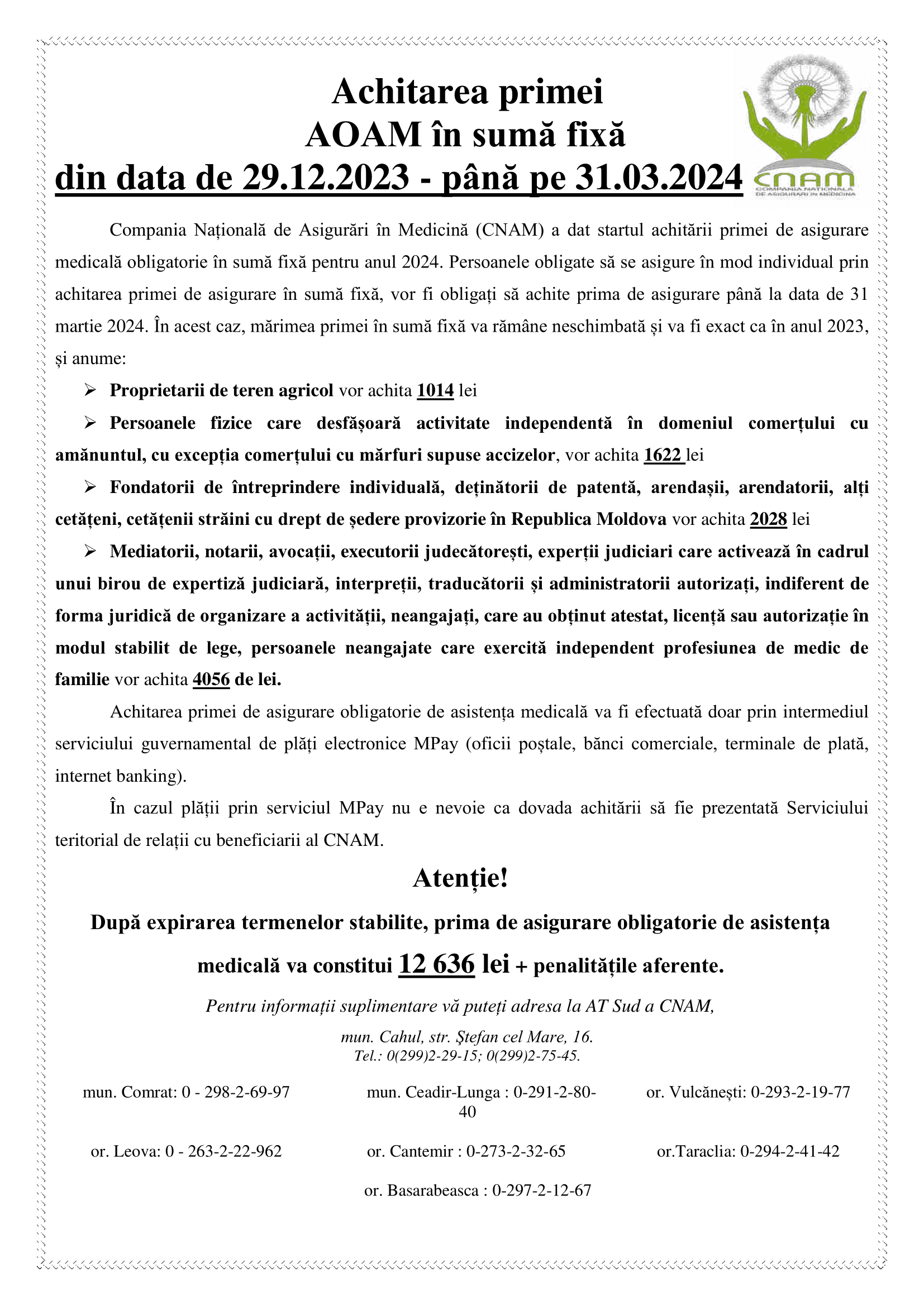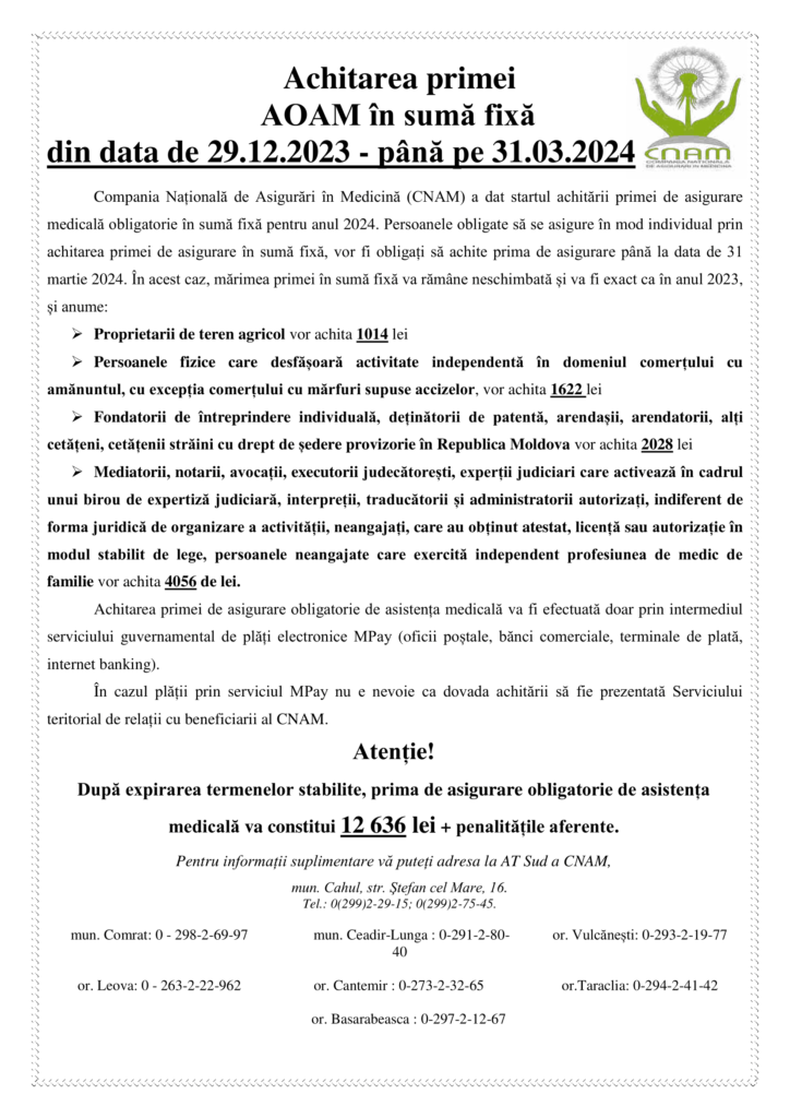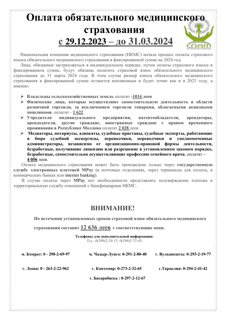 Наличная оплата медицинского страхового полиса производится в банках или отделениях Poșta Moldovei на ИДНП учредителя вышеуказанных категорий. С расчетного счета или фискального кода предприятия перечисления ЗАПРЕЩЕНО.