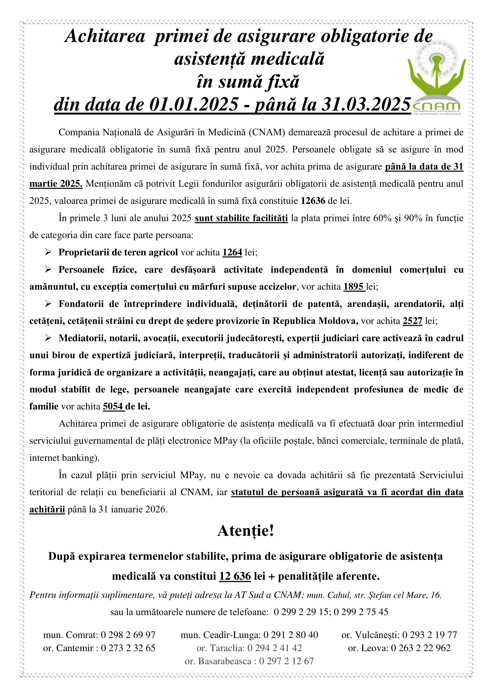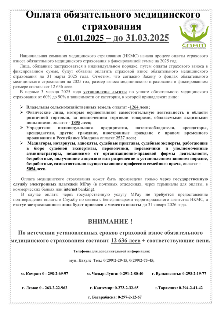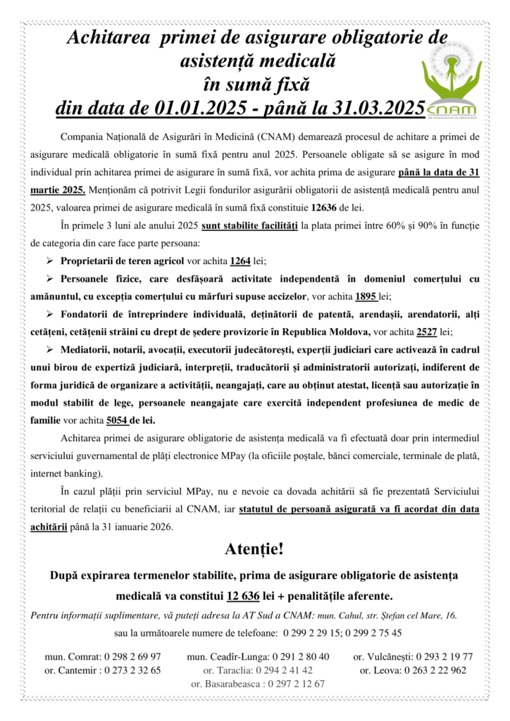 Facilitățile la achitarea până pe 31 martie inclusiv, a primei de asigurare obligatorie de asistență medicală pentru anul 2025 https://cspirjolteni.md/wp-content/uploads/2025/01/SPOT_CNAM_RO.mp3 https://cspirjolteni.md/wp-content/uploads/2025/01/SPOT_CNAM_RU.mp3