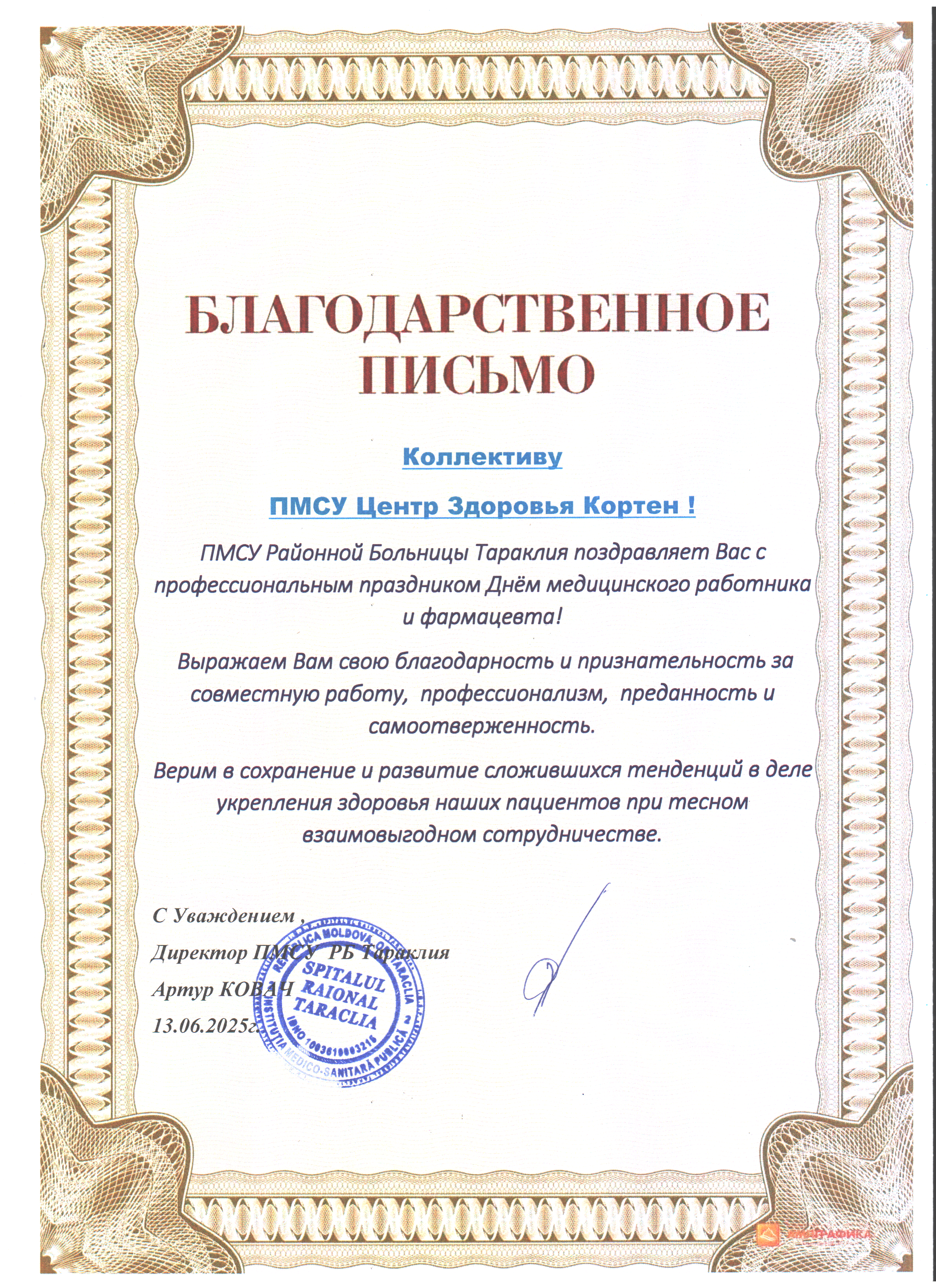 Директор Тараклийской районной больницы Артур Ковач поздравил всех с Днём медицинского работника и вручил заведующей ПМСУ ЦЗ Кортен Диане Чавдарь Благодарственное письмо всему коллективу Центра Здоровья Кортен.